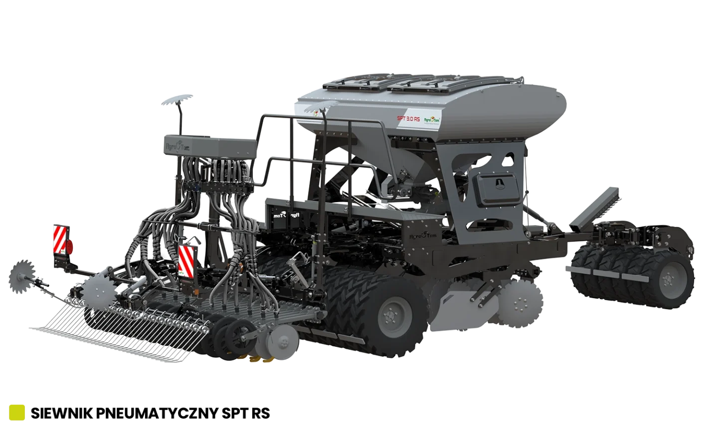 Zestaw uprawowo-siewny SPT RS jest to siewnik pneumatyczny. Sekcja uprawowa siewnika nabudowana składa się z agregatu talerzowego wyposażonego w talerze 510 mm zamontowany na piastach bezobsługowych oraz wału oponowego ułatwiającego transport maszyny.