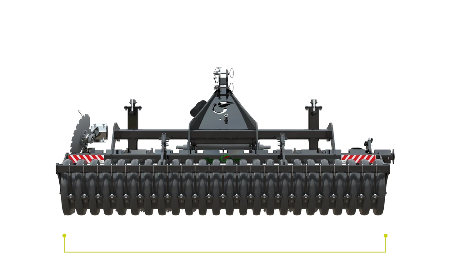 • Wyposażenie standardowe: talerze Ø 460 mm, wał doprawiający (9-rurowy / 12-rurowy / płaskownikowy Ø 500 mm), boczne ekrany, regulowane talerze skrajne, amortyzatory talerzy gumowe, piasty bezobsługowe z uszczelnieniem; regulacja głębokości pracy.